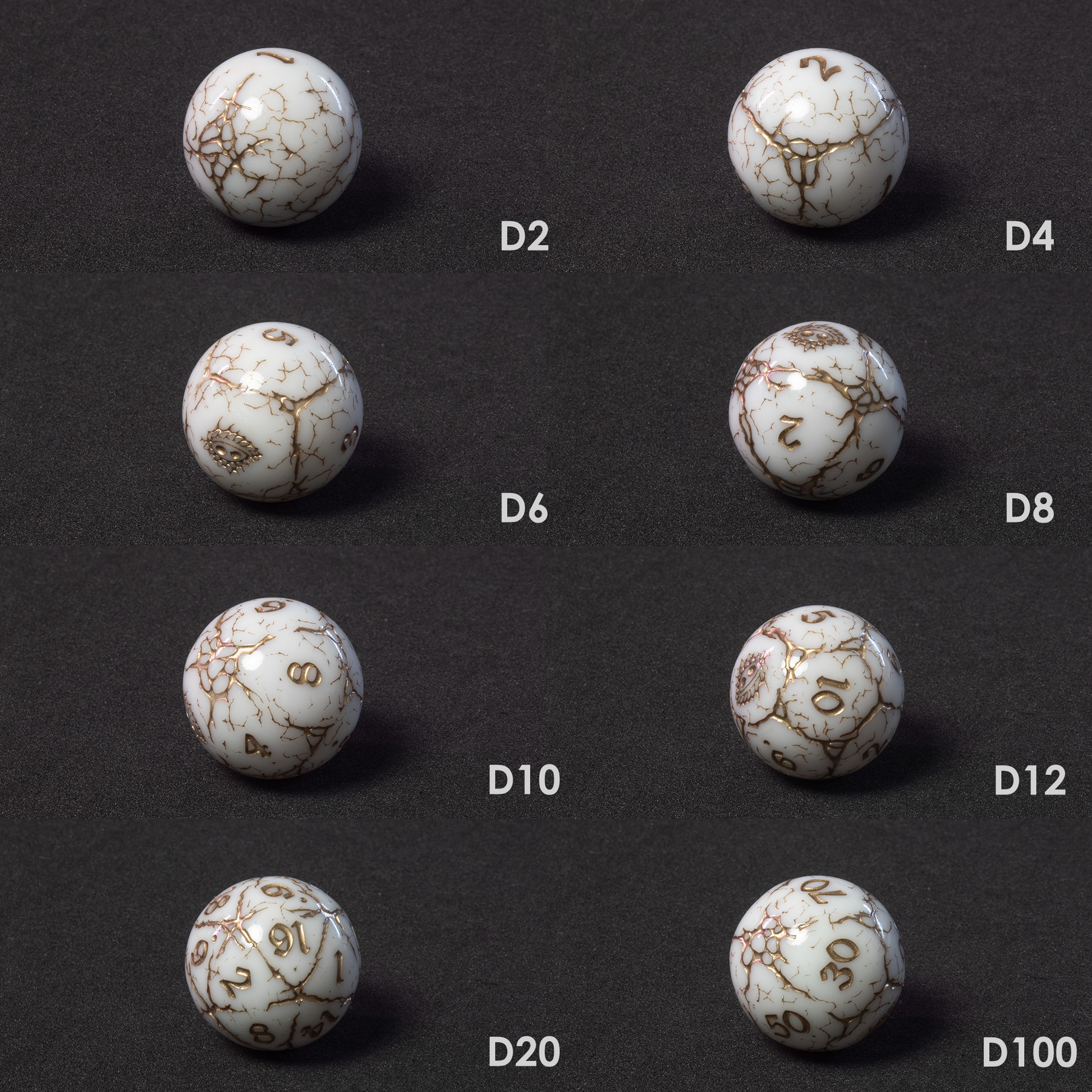 Available in two striking versions—deep black with gold accents or white with gold detailing—Royal Nox stands out as both a gaming tool and a collectible. Intricately engraved surfaces give each die a sculptural, premium look.